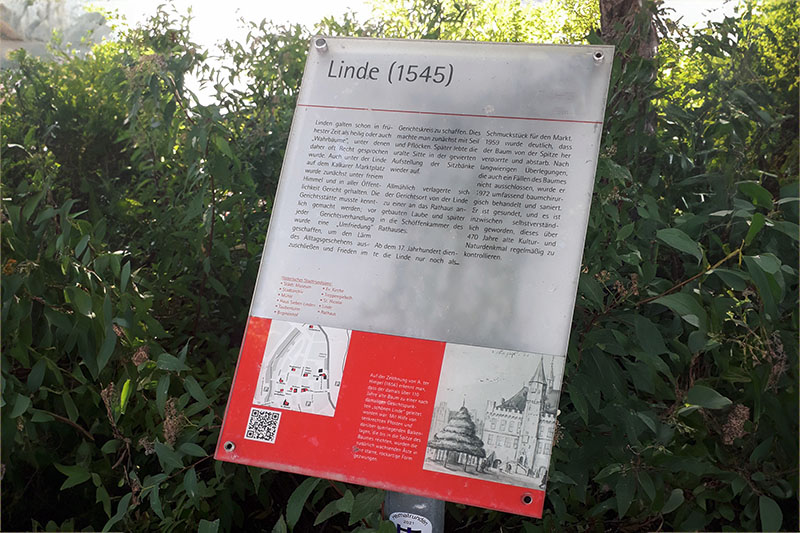 Wer den Stadtkern erkundet, stößt an vielen historischen Gebäuden auf Tafeln des „Historischen Stadtrundgangs“. Jede Tafel informiert über die Geschichte des jeweiligen Ortes – mit Texten, historischen Bildern und einer kleinen Karte, die weitere Stationen des Rundgangs zeigt.