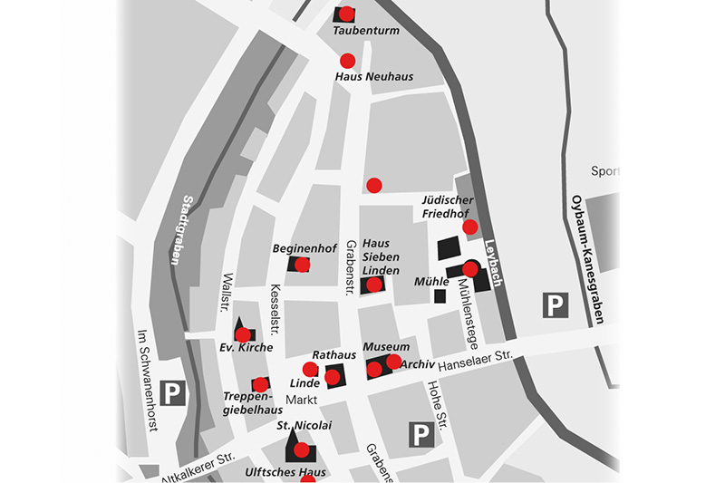Die Stationen führen zu bedeutenden Bauwerken, kulturellen Einrichtungen und besonderen Erinnerungsorten. Dazu gehören zum Beispiel der Beginenhof, die evangelische Kirche, der Marktplatz mit der steinalten Gerichtslinde, die Stadtwindwühle, das historische Rathaus, der Taubenturm, Treppengiebelhäuser am Markt und in dessen näherer Umgebung sowie die für ihre mittelalterlichen Schnitzaltäre und neuzeitlichen Fenster international bekannte St.-Nicolai-Kirche.